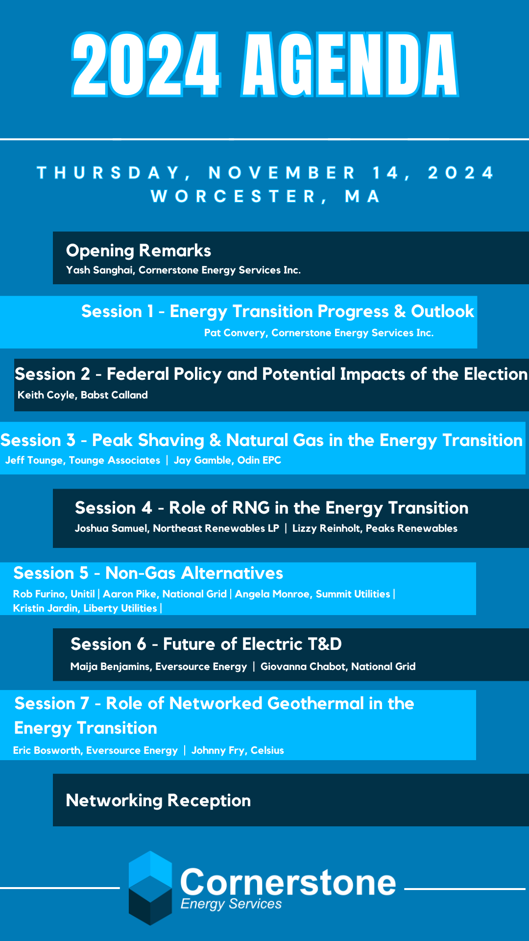 Our panels this year included Opening Remarks with presenter Yash Sanghai, Energy Transition Progress & Outlook with presenter Pat Convery, Federal Policy & Impacts of the Election with presenter Keith Coyle, Peak Shaving & Natural Gas with presenters Jeff Tounge and Jay Gamble and moderator Craig Thomas, Role of RNG with presenters Lizzy Reinholt and Joshua Samuel and moderator Ryan Garcia, Future of Electric T&D with presenters Maija Benjamins and Giovanna Chabot and moderator Liz Parsons, Non-Gas Alternatives with presenters Aaron Pike, Angela Monroe, and Rob Furino and moderator Helen Ayotte, and Role of Networked Geothermal with Johnny Fry and Eric Bosworth and moderator Anthony Sweeney.